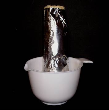 Now wrap some kitchen foil around the loofah and also one end. Seal the edges with sellotape. Then stand your wrapped up loofah in a suitable container just in case any of your soap leaks out whilst you're pouring your melted soap into the top.